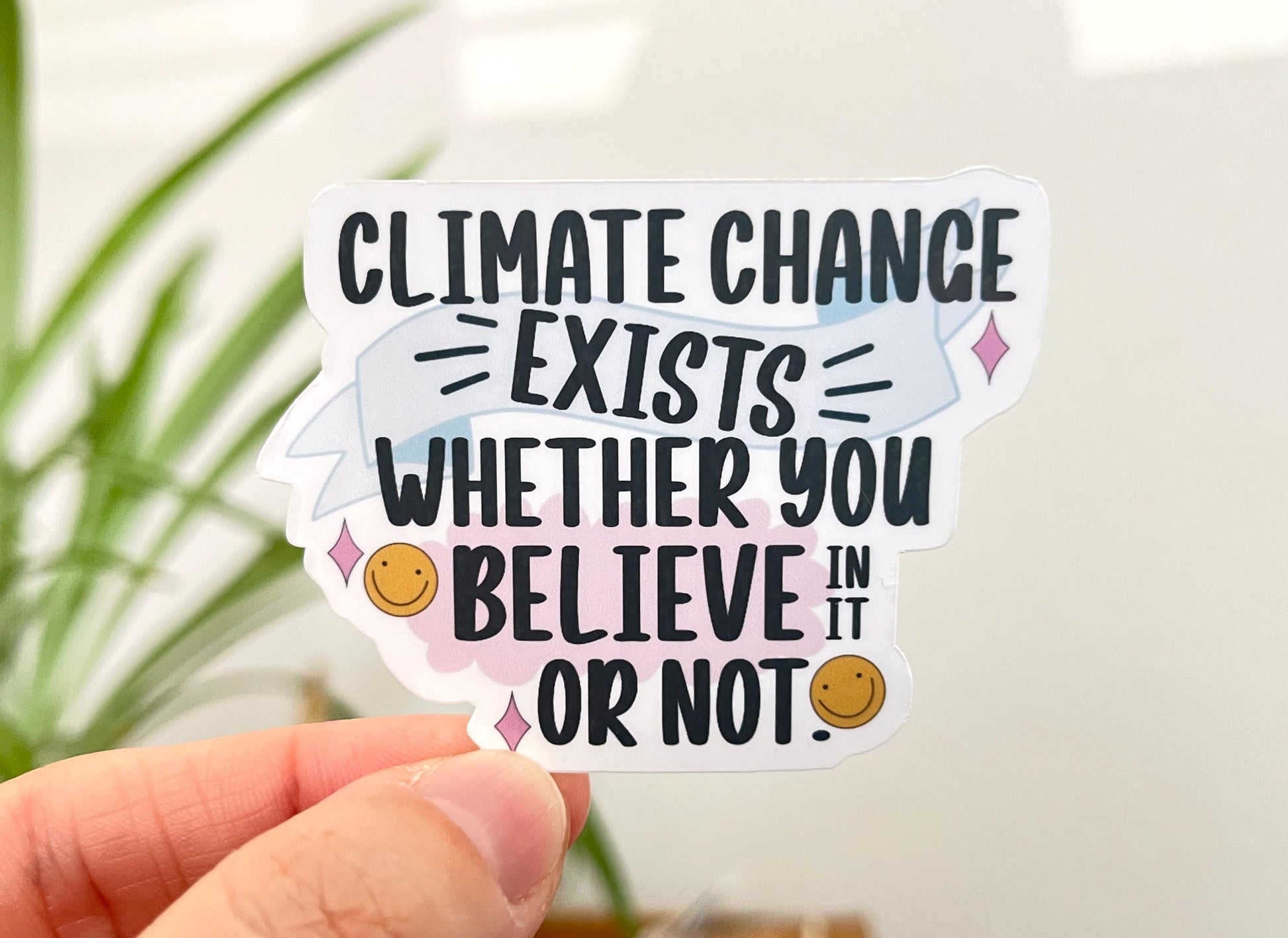 “Climate change exists whether you believe it or not“ waterproof vinyl sticker.