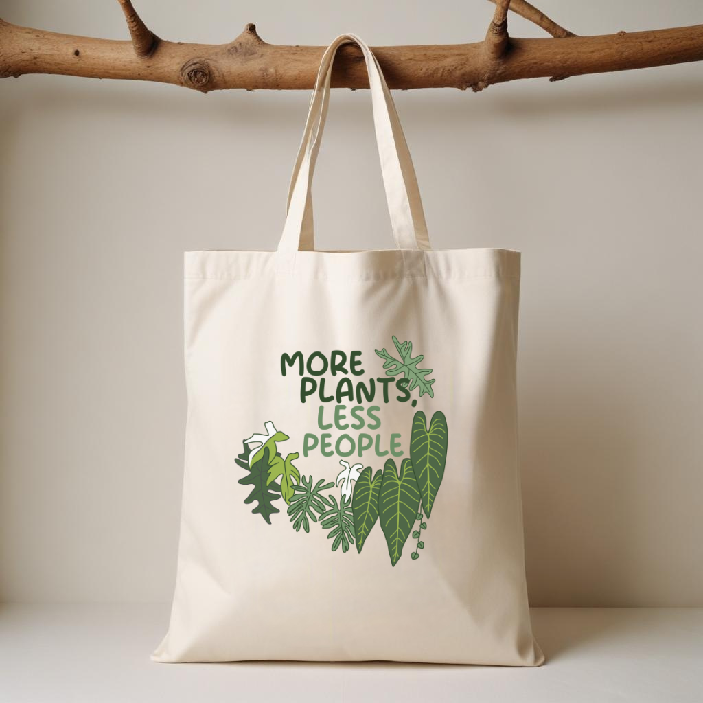 "More plants, less people" natural cotton canvas tote bag.